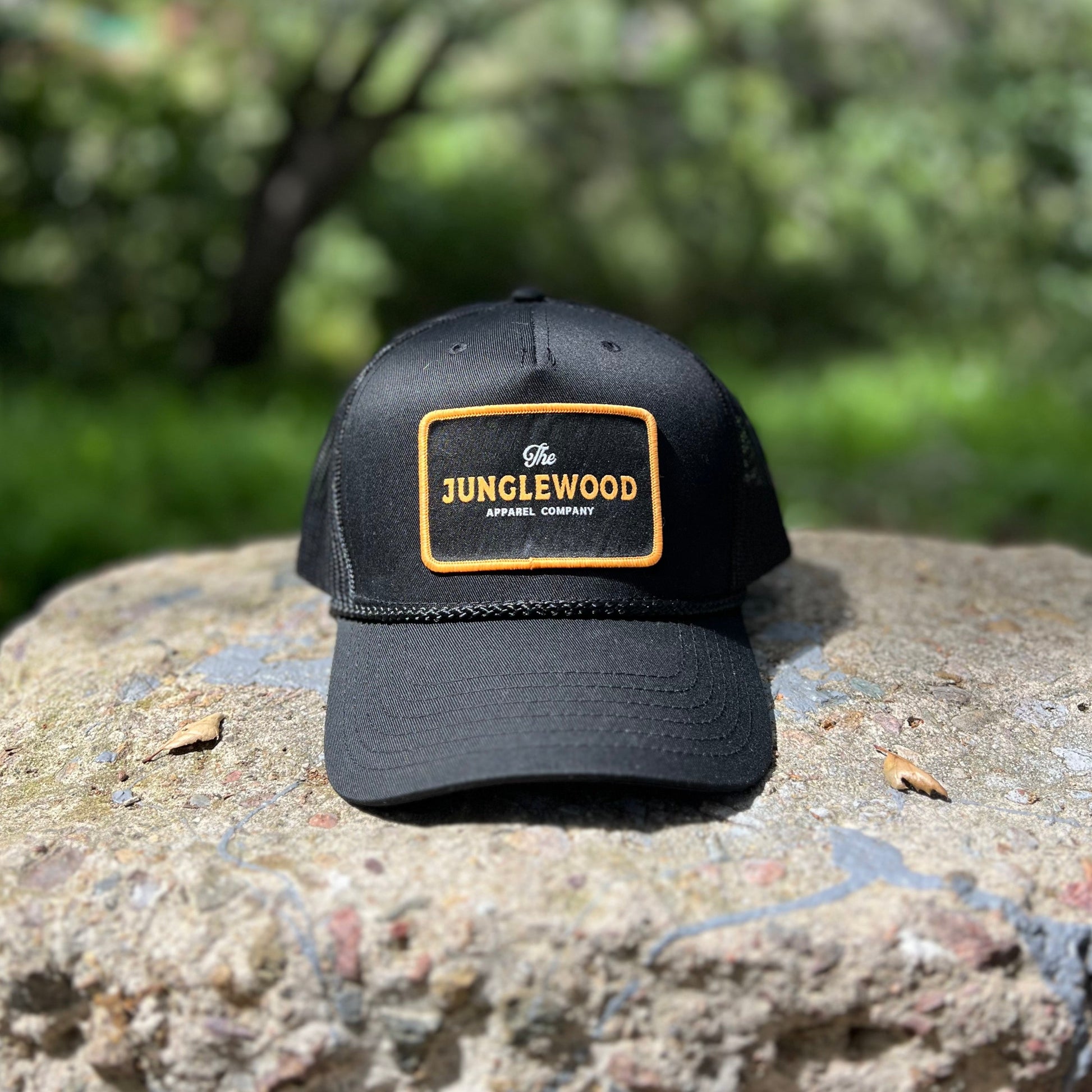 The Junglewood Patch Hat in black. This classic features a custom Junglewood Apparel patch sewn on the front of a timeless trucker hat with mesh back.