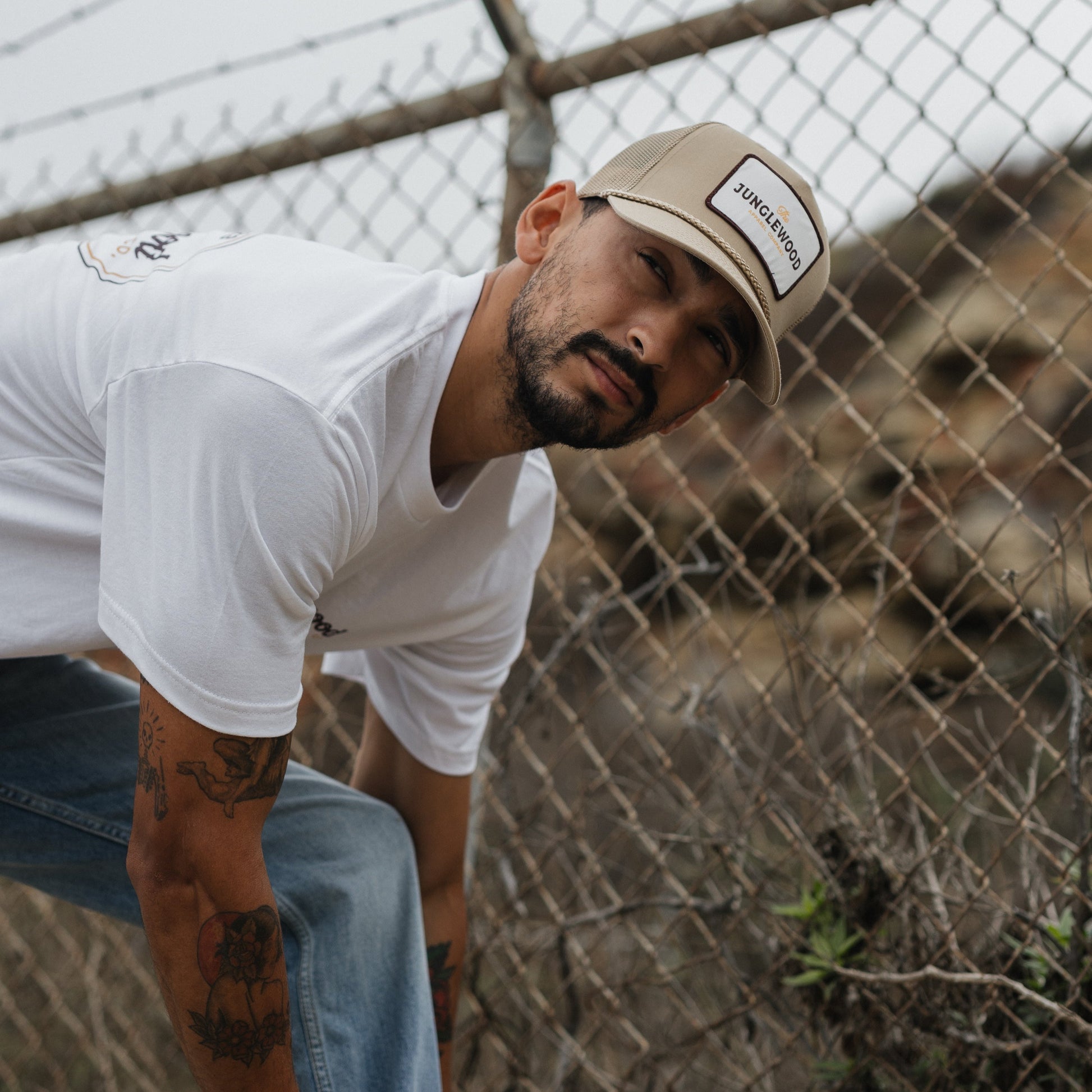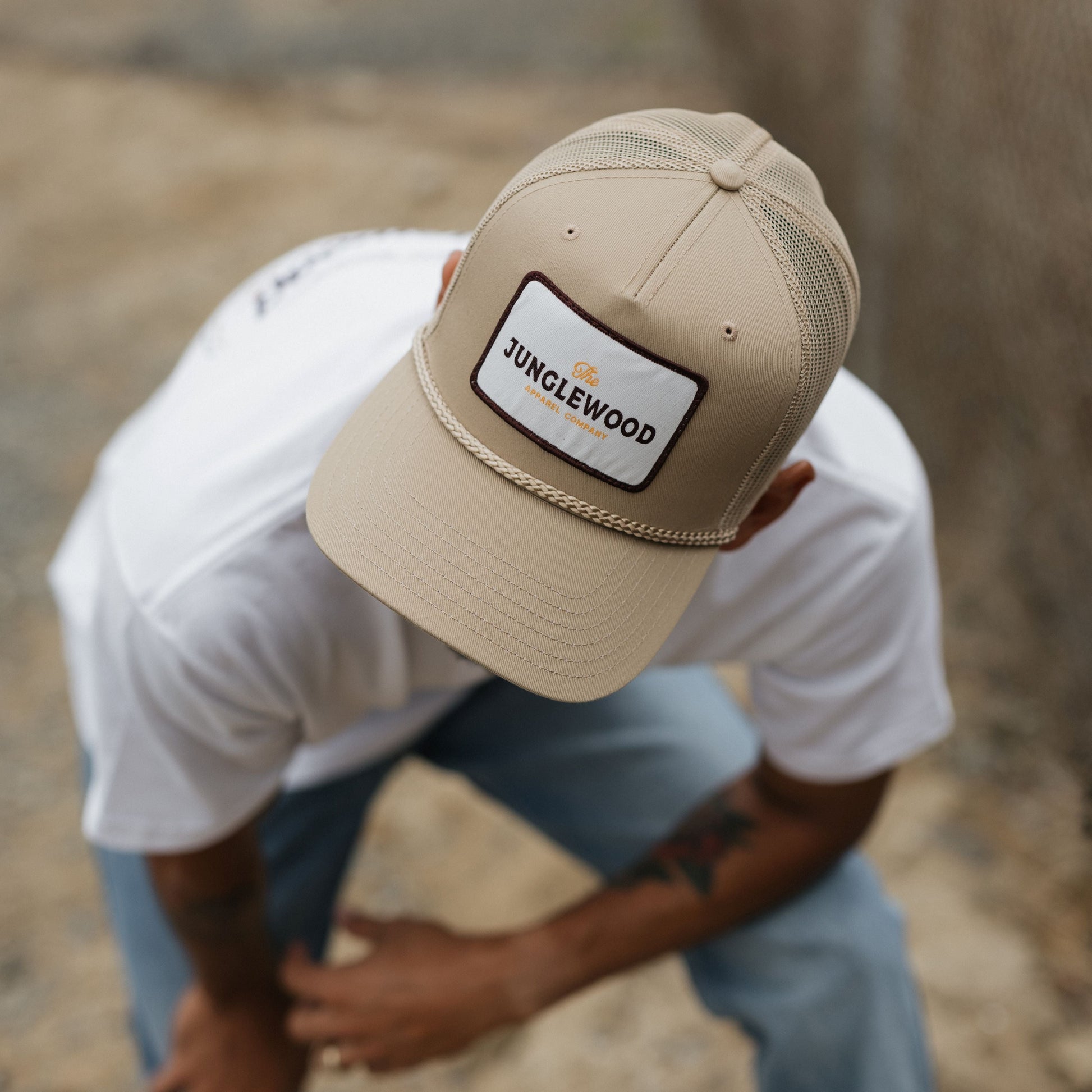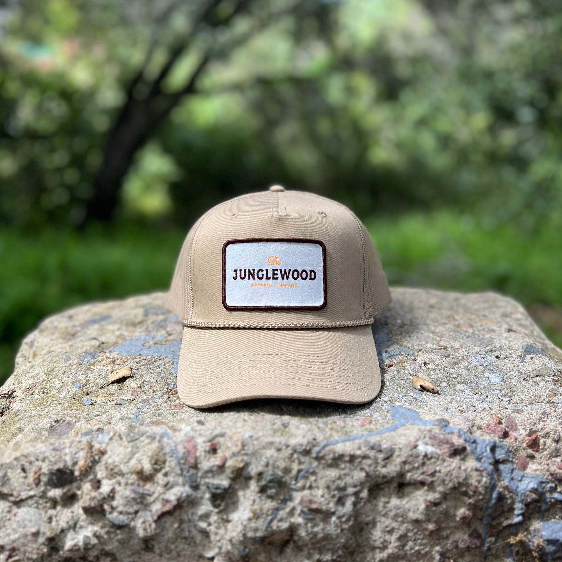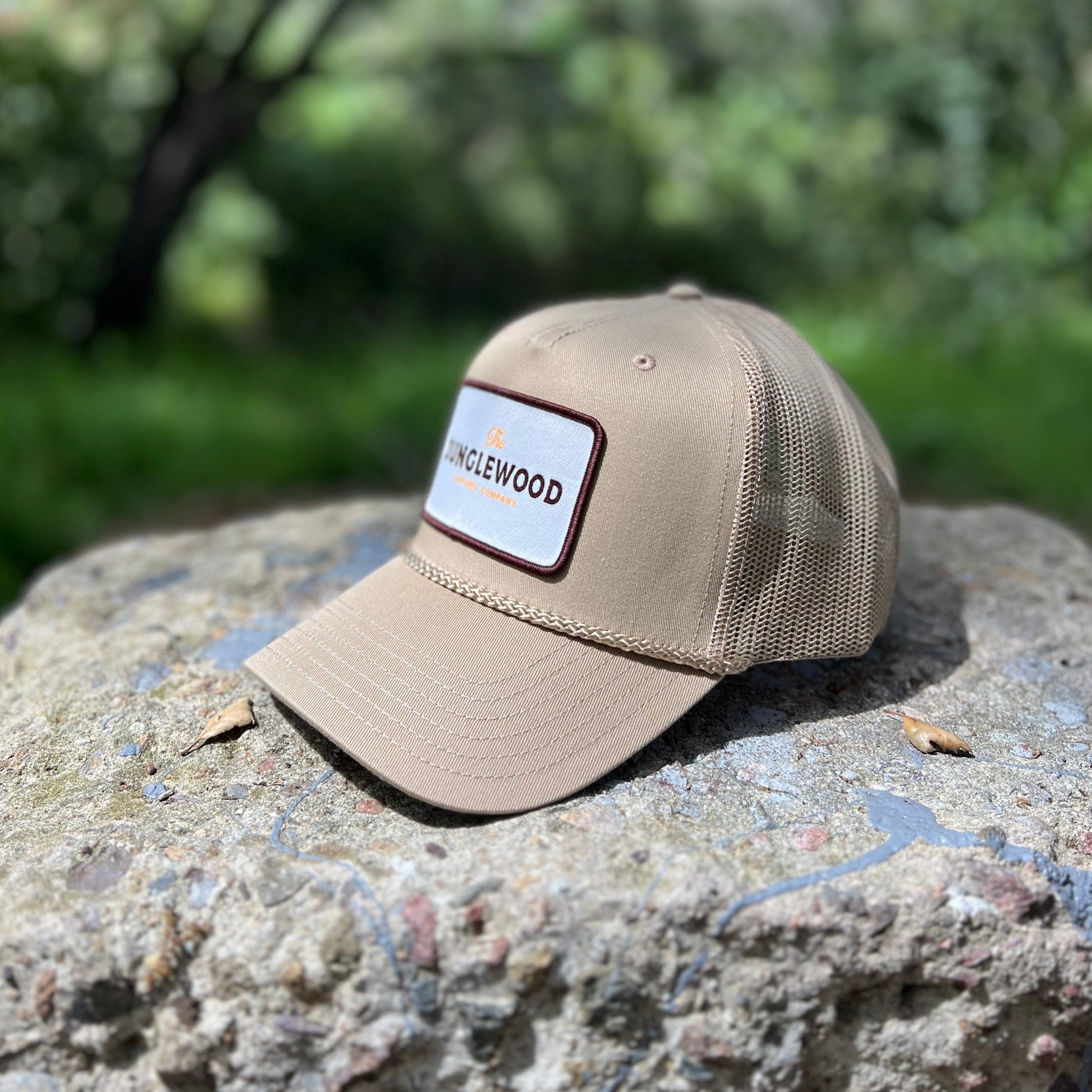 The Junglewood Patch Hat in khaki. This classic features a custom Junglewood Apparel patch sewn on the front of a timeless trucker hat with mesh back.
